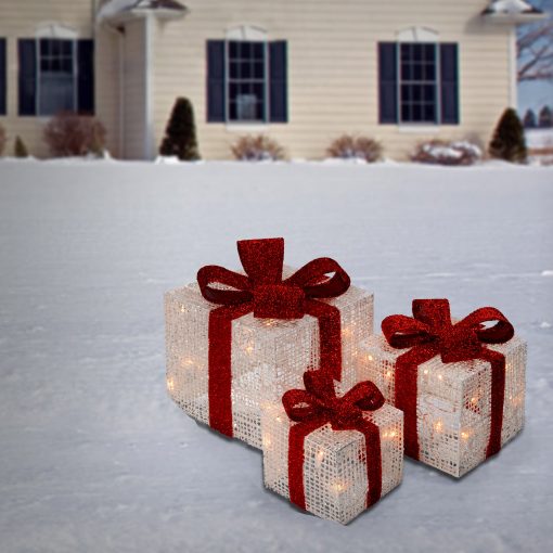 This attractive pre-lit Gift Box Assortment includes three white sisal thread boxes wrapped with rigid red ribbons and bows. Box sizes are 10. 8 and 6 and contain a total of 35 clear lights. The glittered sisal material is strong and durable to provide many years of enjoyment and can be displayed in indoor or covered outdoor locations.