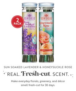NEW Sun-Soaked Lavender doesn’t shy away from being authentic with fresh. herbaceous. just-picked scent. It takes you right to a peaceful lavender field under a clear blue sky with sun on your face and the scent of lavender on the wind. Featuring notes of lavender. crisp ozone. eucalyptus. and driftwood. Paired with NEW Honeysuckle Rose which captures the essence of spring’s charm. with the sweet fragrance of honeysuckle intertwined with the natural scent of fresh-cut roses. This is not your Grandma’s rose perfume – this is a very fresh floral experience featuring notes of rose water. aloe and green leaves. citron. honeysuckle. and sandalwood. Included are NEW Scenter Stakes. making it easy to enhance your florals and plants with Real. Fresh-Cut scent. Simply add a Scented Ornament stick to the end of the Scenter Stake and place in plants (dirt. water. faux foam. etc.). leaving enough of the stick exposed to diffuse scent. Made of sustainable paper and infused fully with pure fragrance. Scentsicles Scented Ornament Sticks bring plants. florals. wreaths. and greenery to life for 30 days or more!